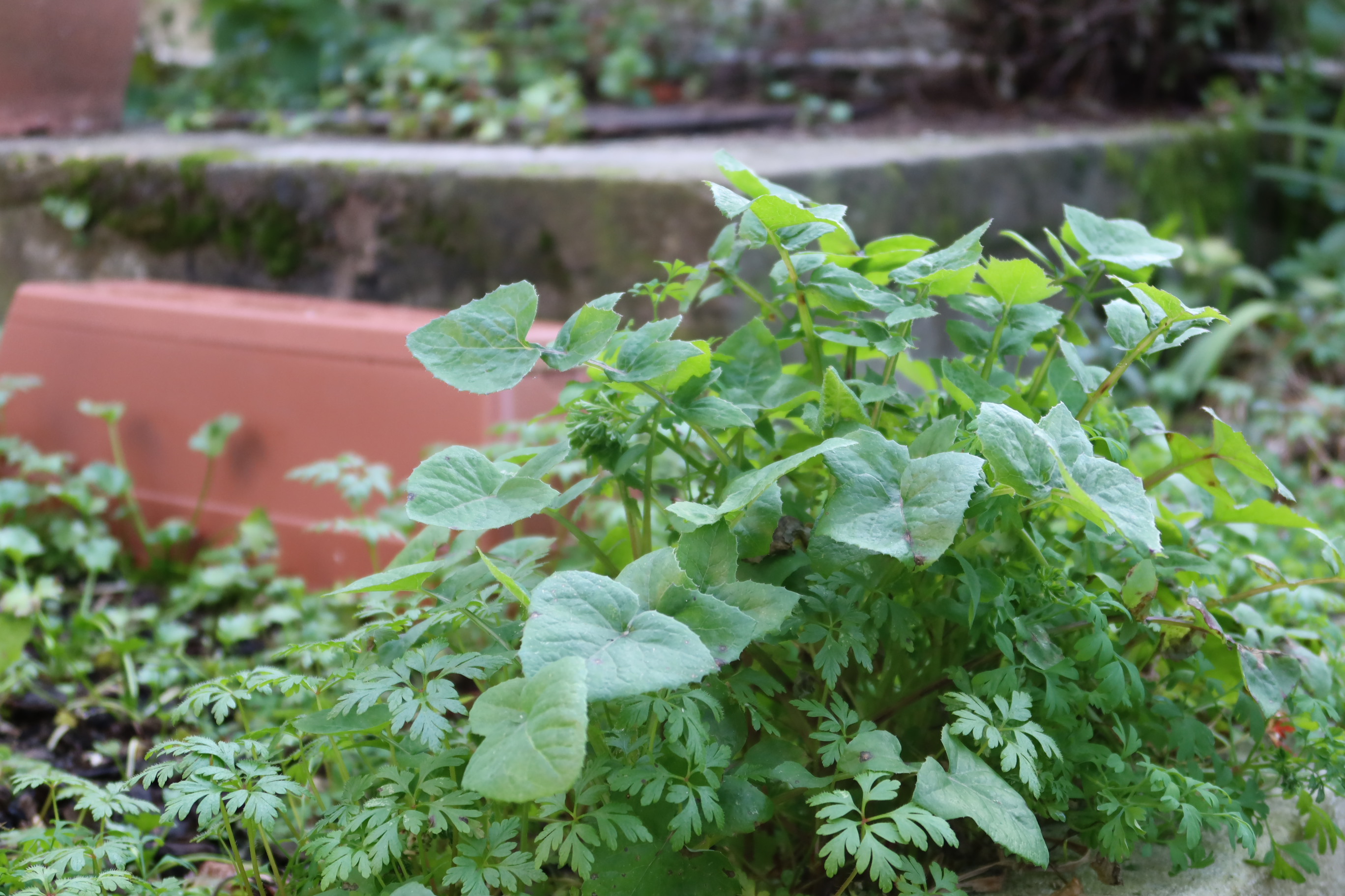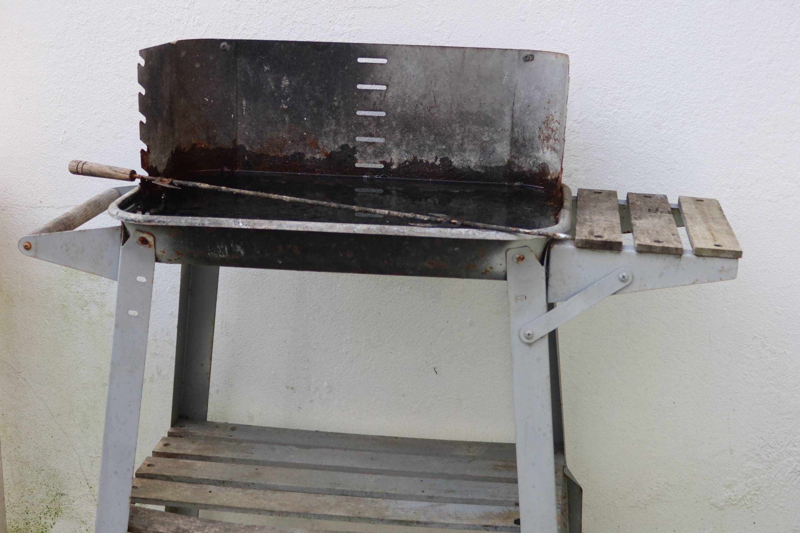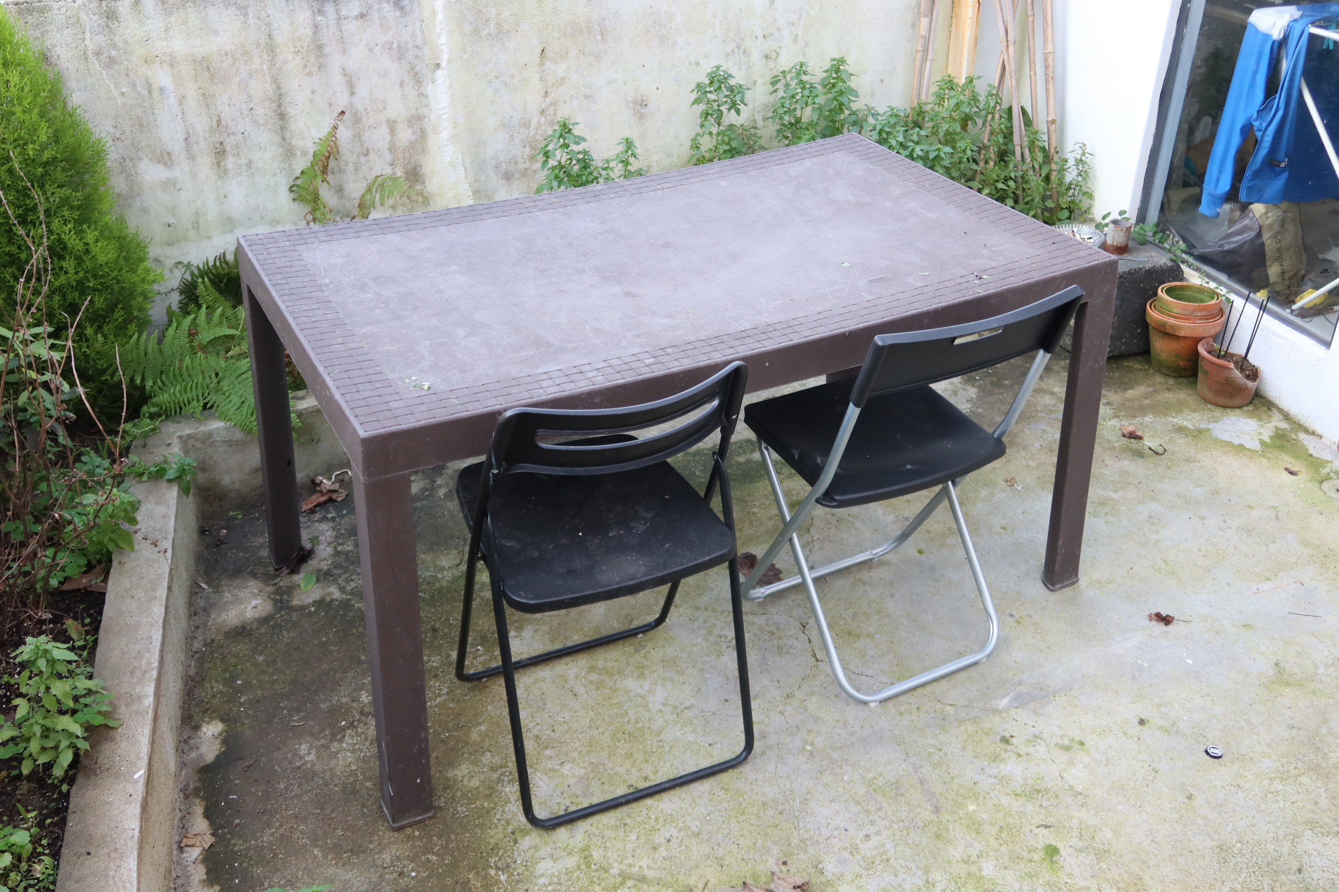 Outdoor garden and patio with a barbecue grill and aromatic plants.