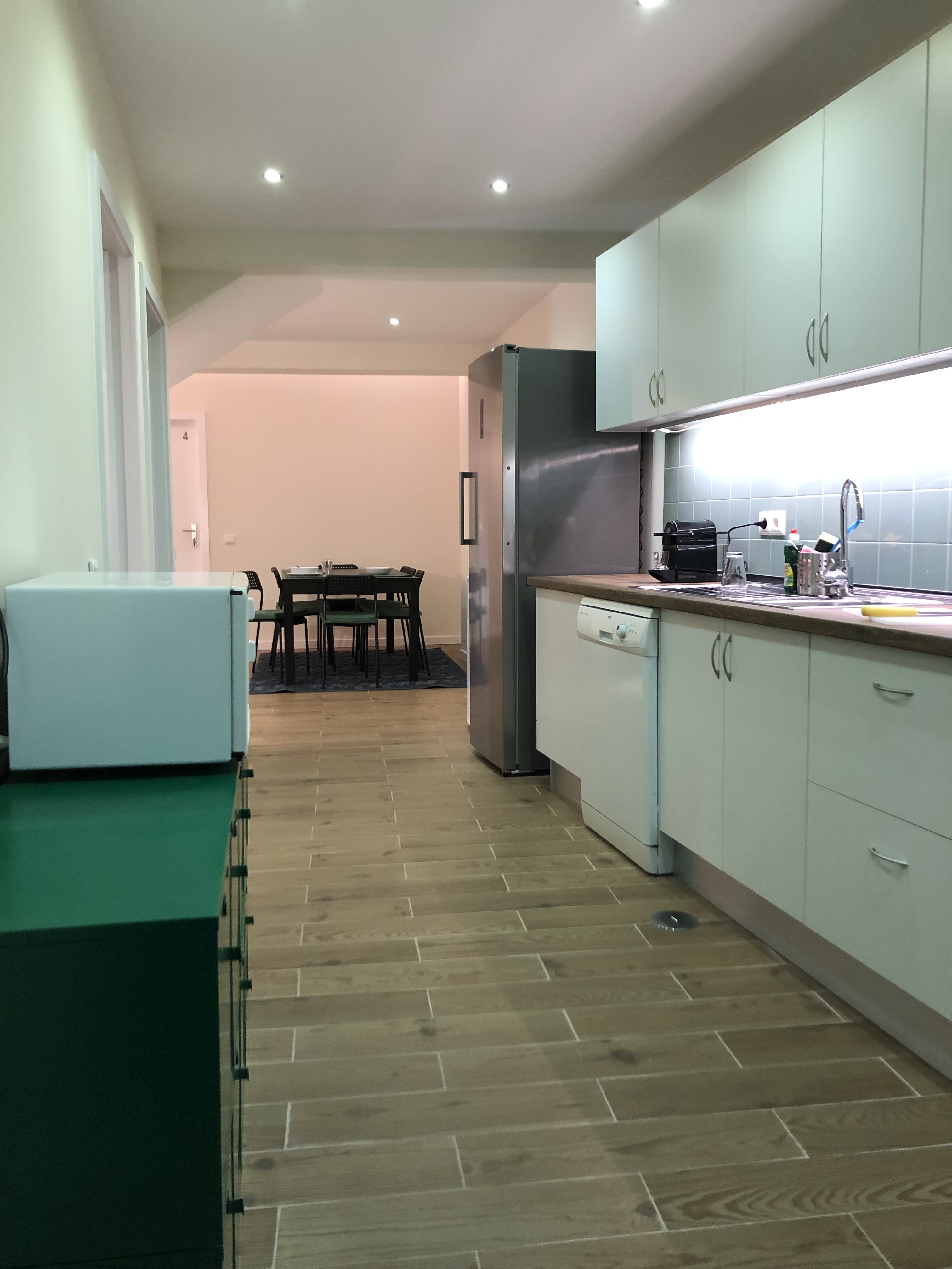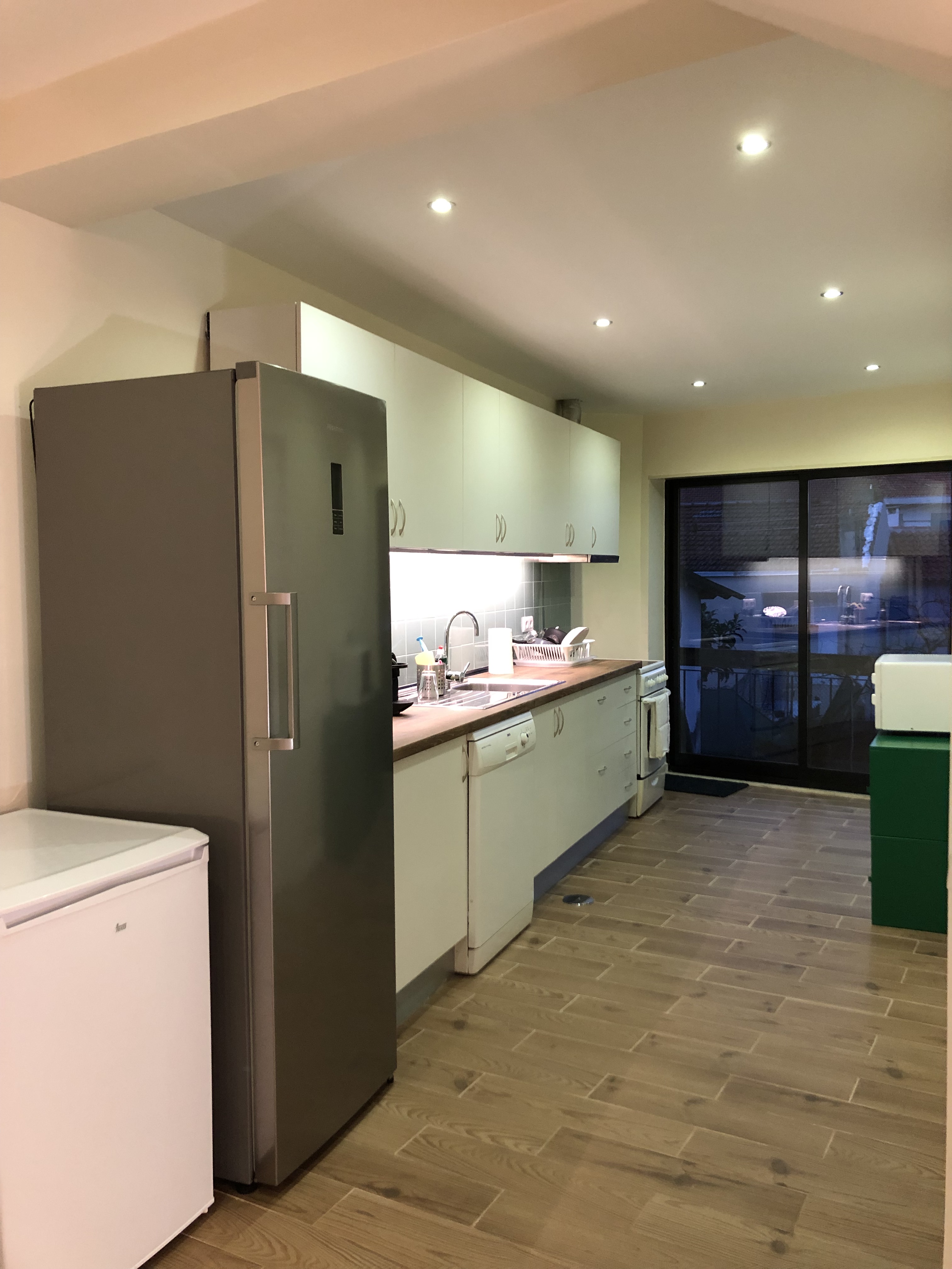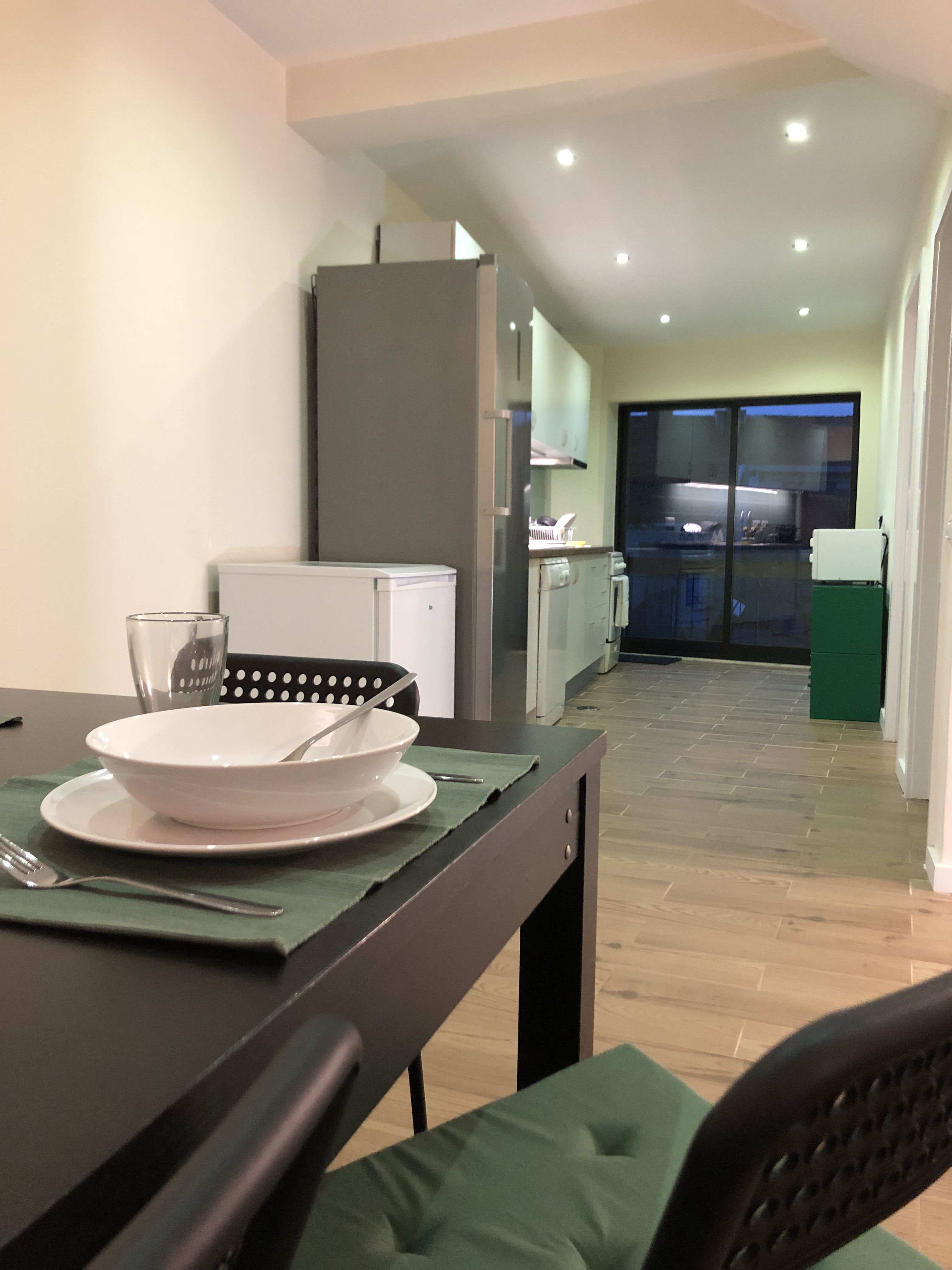 Big shared kitchen with spacious eating/social area – with hob, oven, microwave, dishwasher, big fridge, freezer, coffee machine, toaster, mixer, dishes, glasses, cutlery and all equipment you may need to cook and to eat.